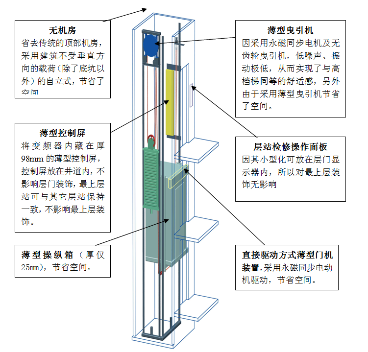 ELENESSA無機房電梯(結(jié)構(gòu)見下圖)具有高度自由化的布置方式和省空間的結(jié)構(gòu)設(shè)計,且具有節(jié)能性、舒適性和高安全性,具體特點如下:
